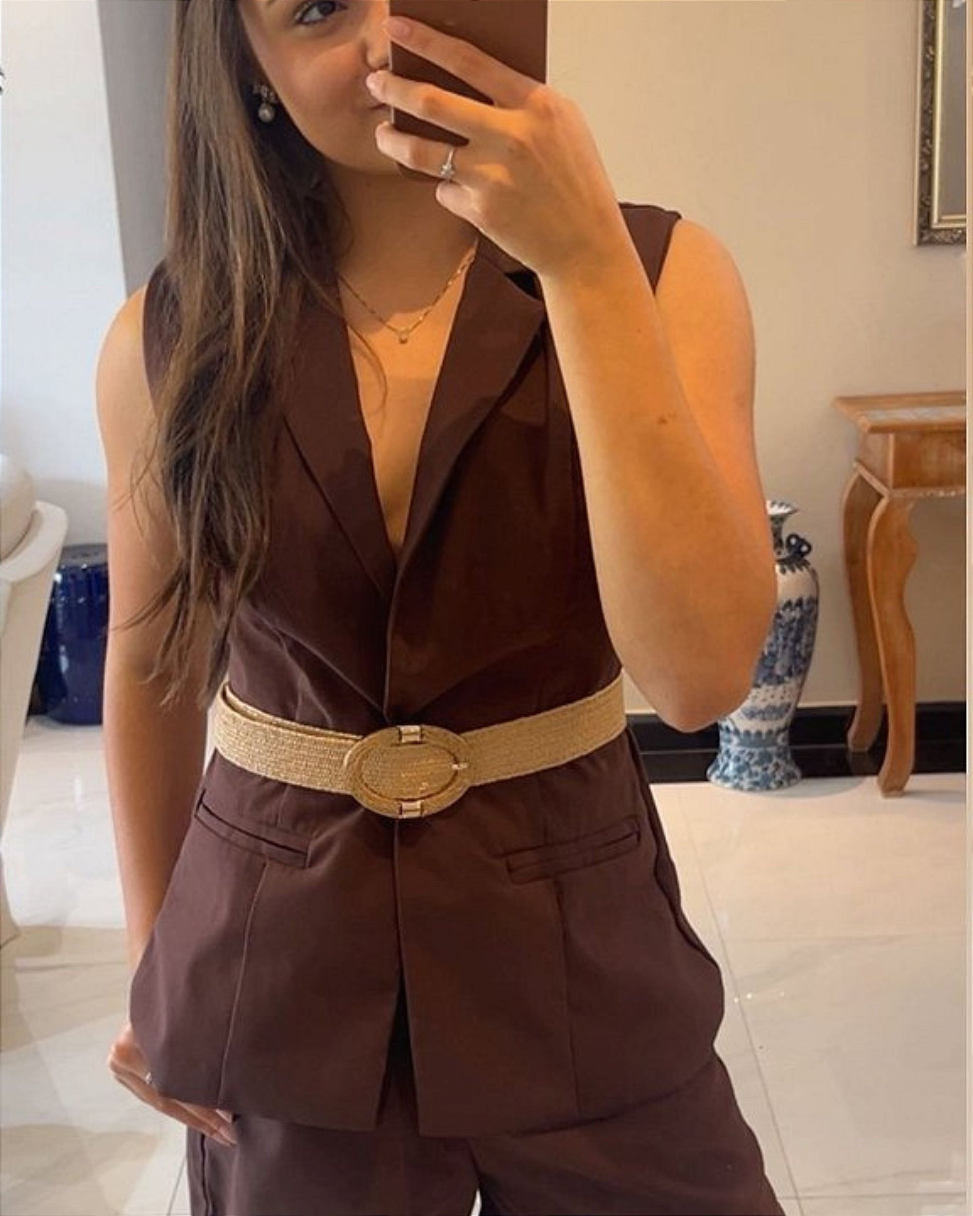 Colete Donatella Marrom de alfaiataria estruturado, caimento perfeito , alongado, ótimo para usar com as calças de alfaiataria ou com os shorts , podendo ser uma excelente opção para fazer sobreposições com camisas.