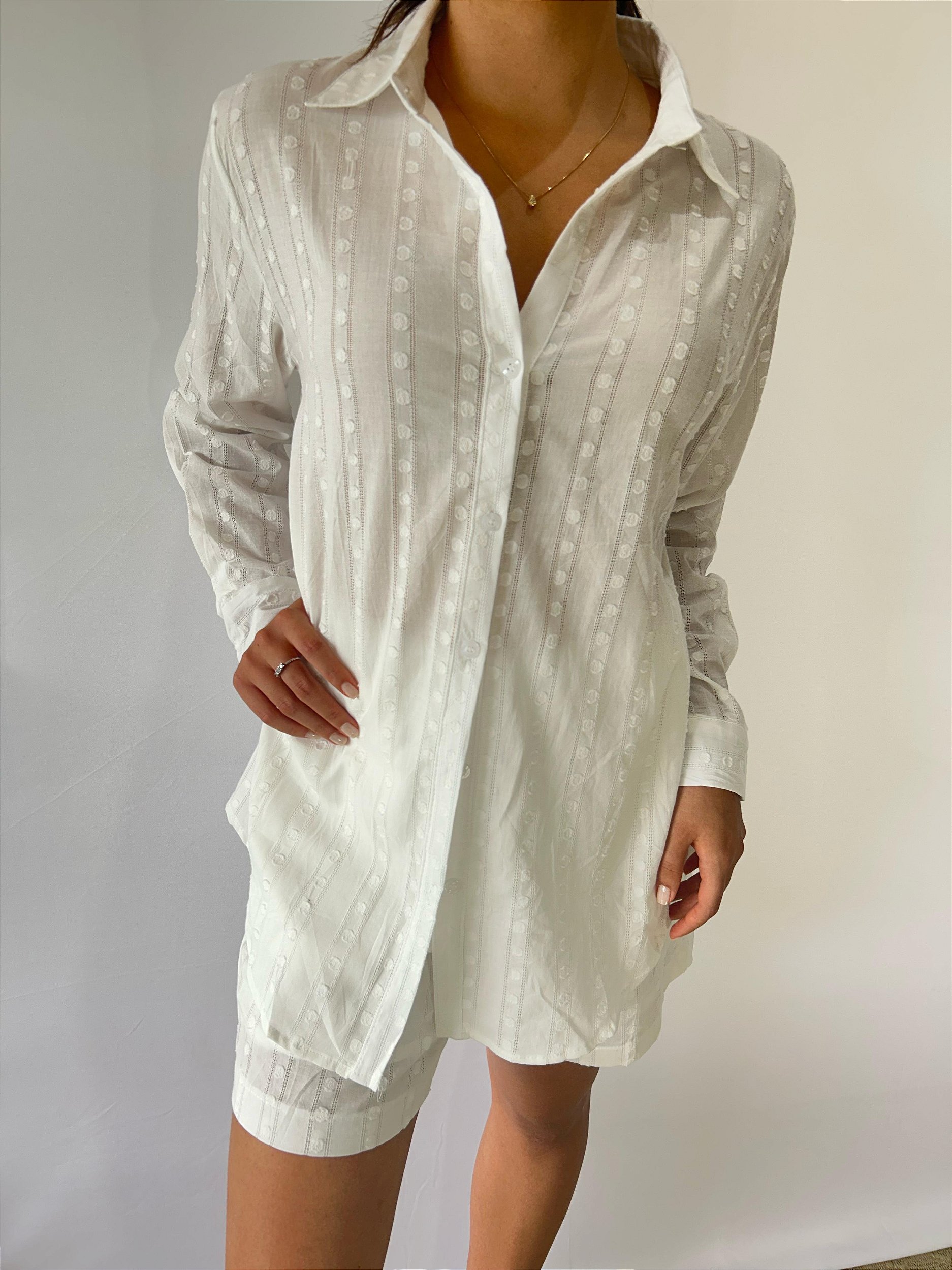 O Conjunto French é uma combinação de camisa e shorts, leve e com uma textura delicada e leve, feito em algodão, perfeito para usar o look total, fazendo um conjunto chique e veranil para usar diariamente, mas as peças separadas são bases excelentes para compor outros looks.