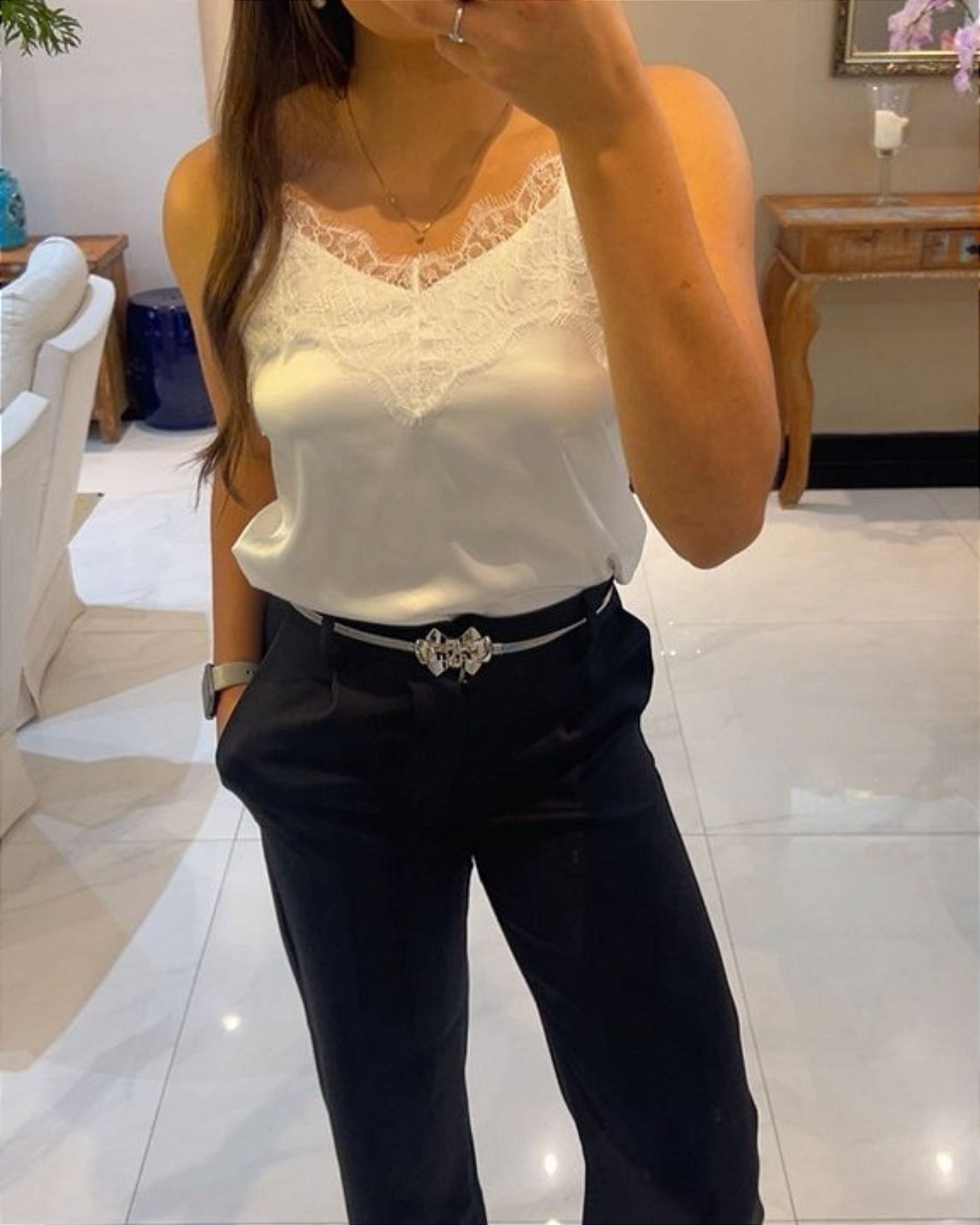 Regata Cetim Lavans , modelo impecável, regulador nas alças,possui uma renda delicada e feminina, Essa regata e perfeita para usar com calças, saias, blazer e deixar o look ainda mais feminino e elegante.
