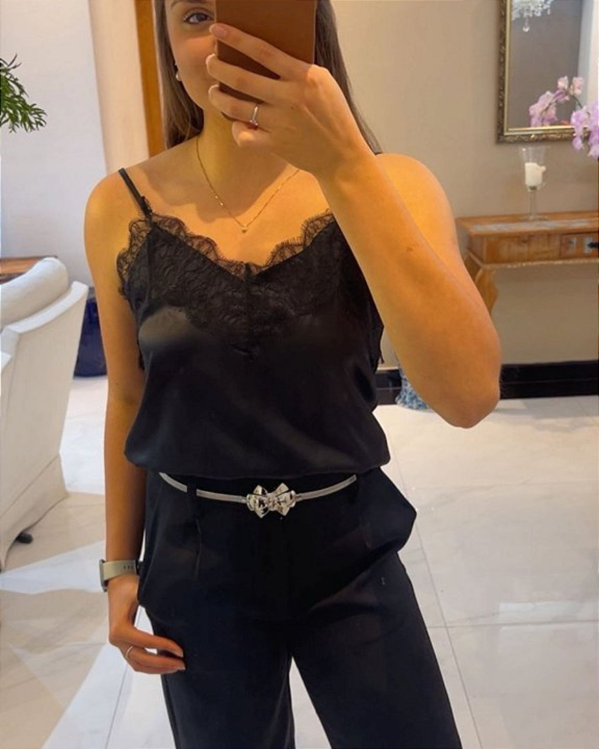 Regata Cetim Lavans , modelo impecável, regulador nas alças ,possui uma renda delicada e feminina, Essa regata e perfeita para usar com calças, saias, blazer e deixar o look ainda mais feminino e elegante.